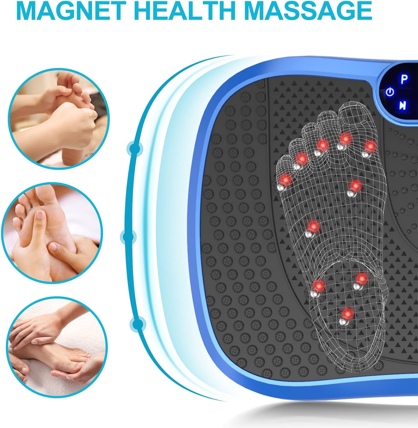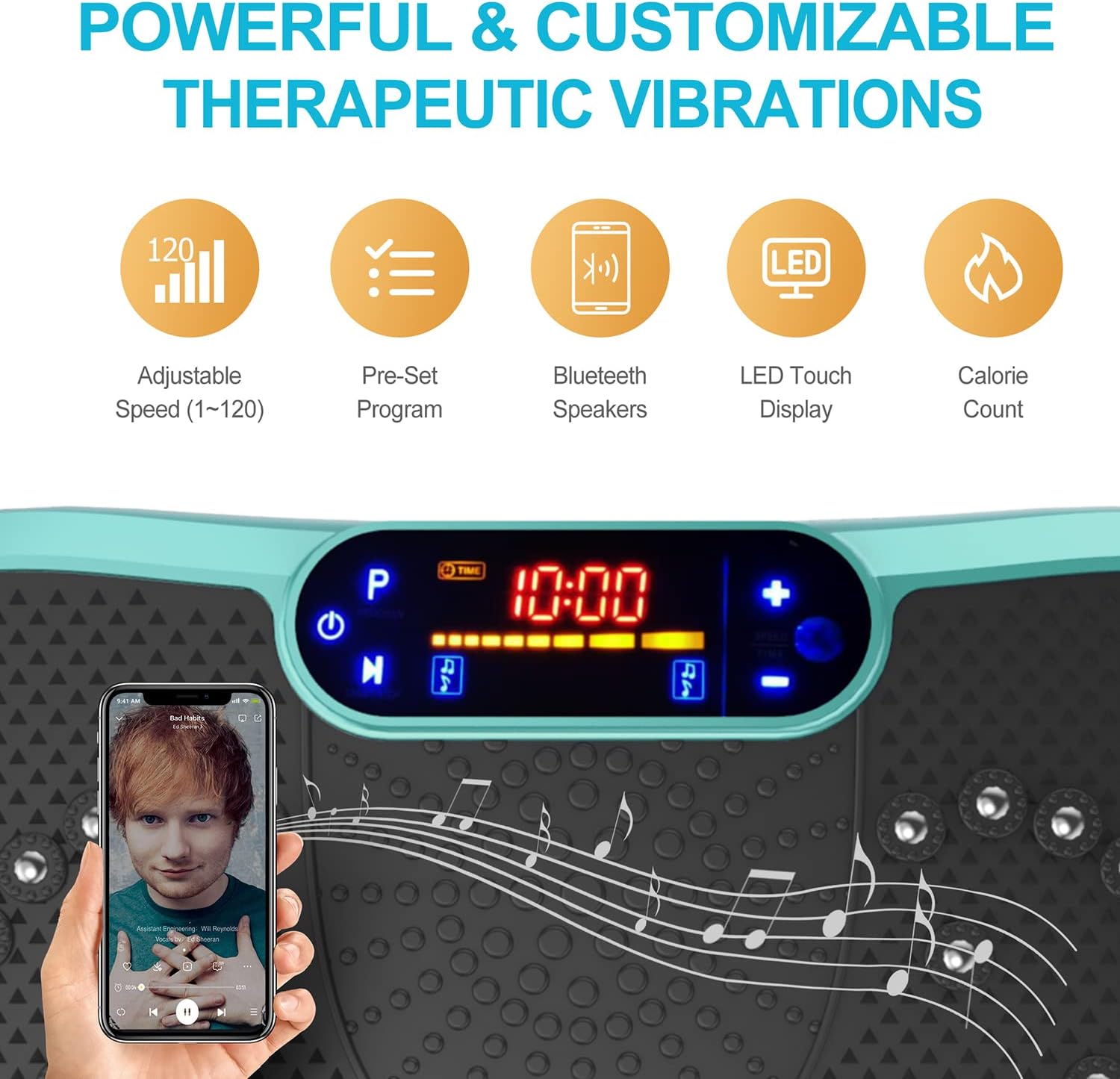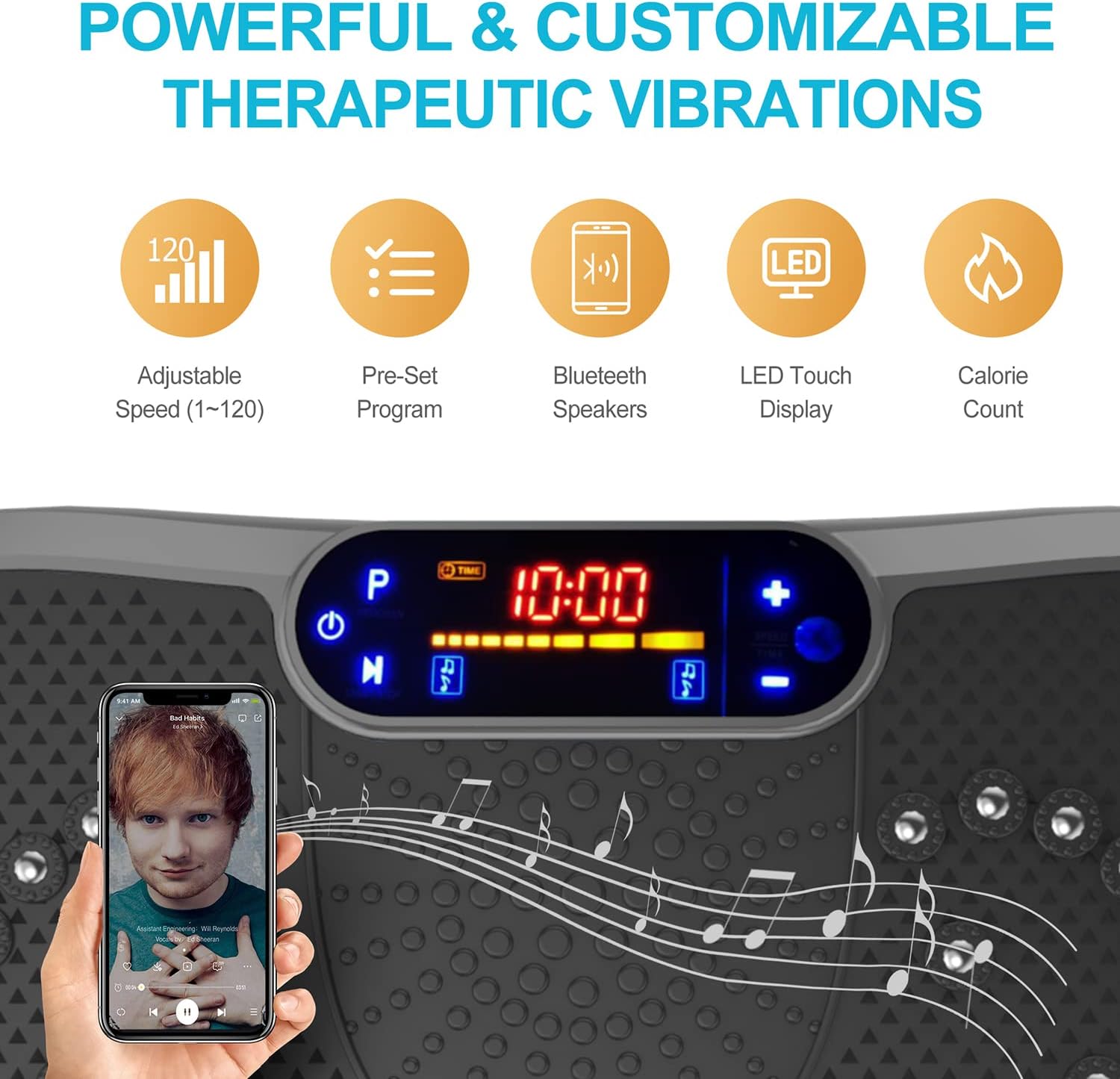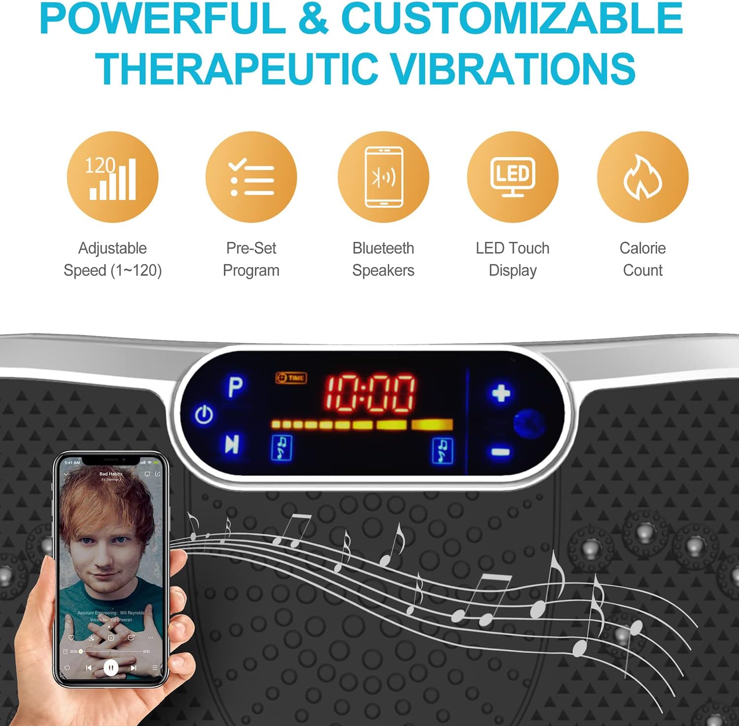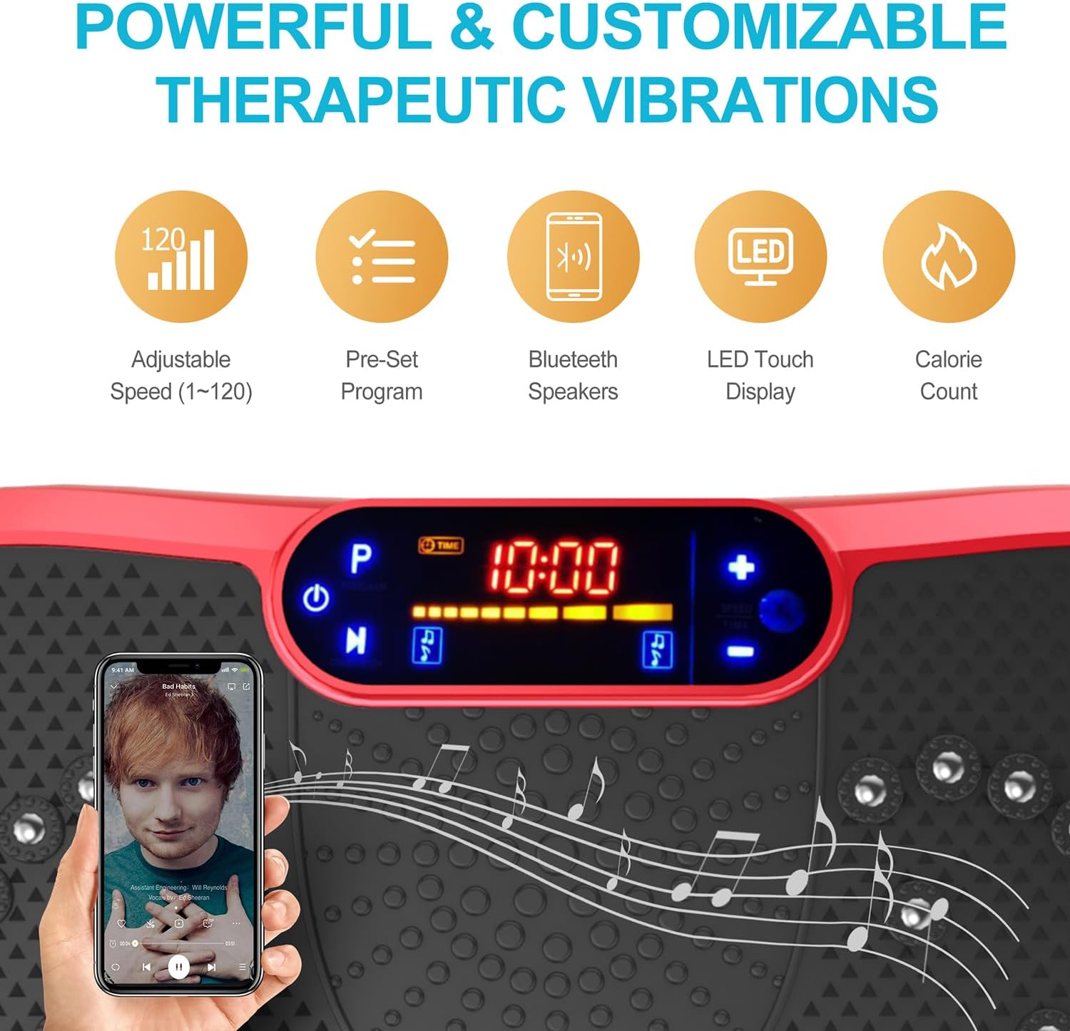 - ✅WHY WE CHOOSE AXV VIBRATION PLATE: Can be connected to phone via BT and used as BT speaker; Magnet health massage function; LED display shows time, speed and burnt fat making your workout visible; Compact size can be used anywhere & easy to carry and store; Anti-slip coating designed;Enhanced upgraded Ergonomic design shell ensures more durability and stability; Comes with Remote control ,Resistance Bands and detailed manual...everything you need.