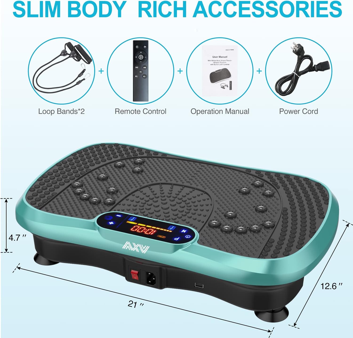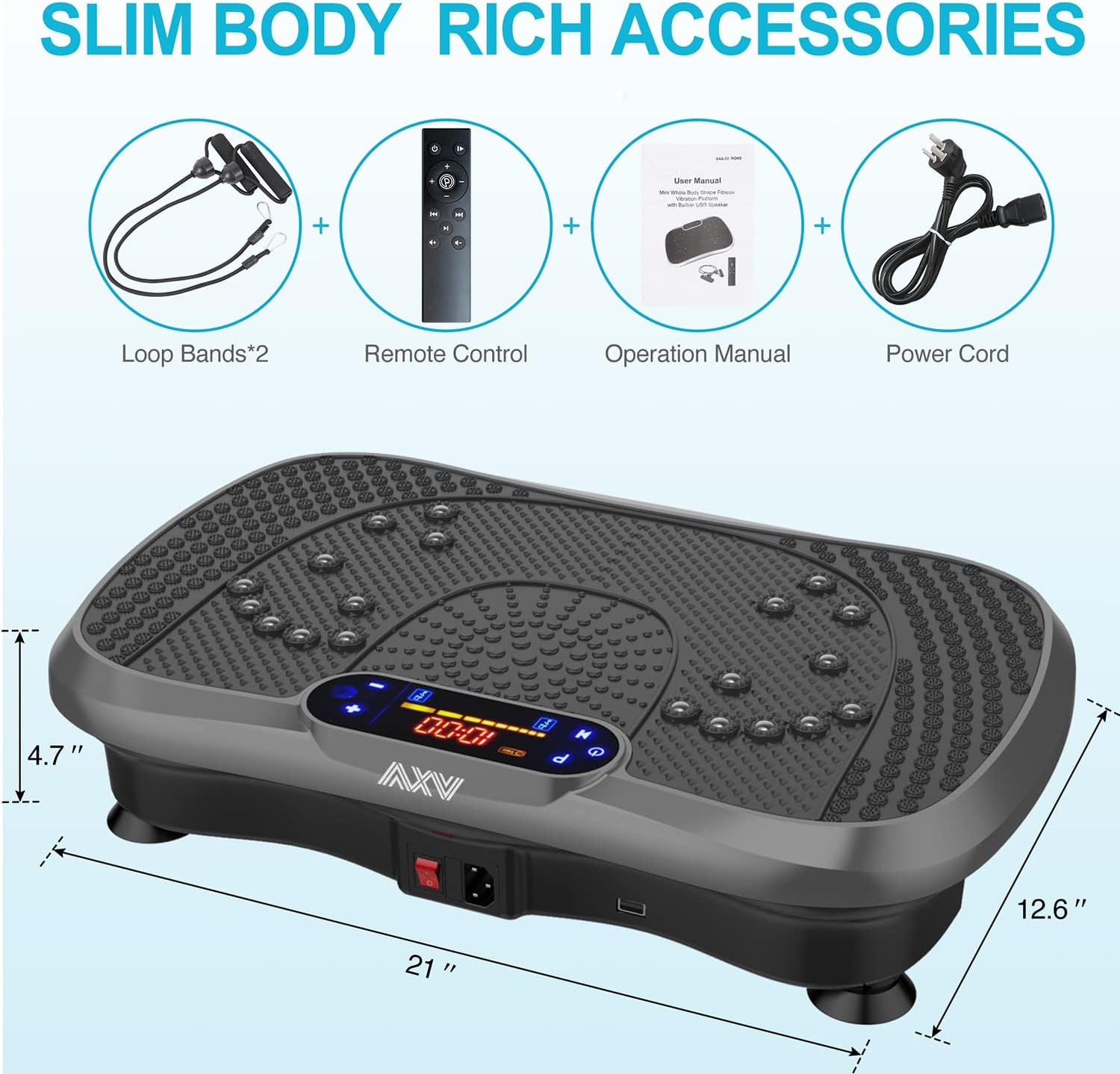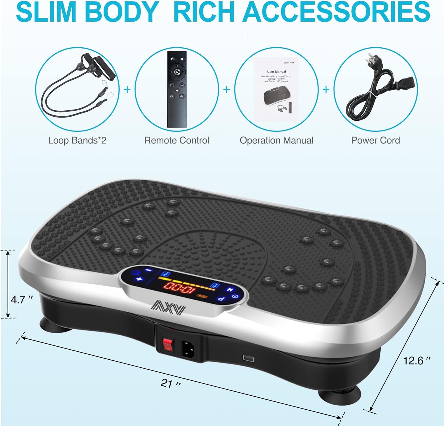 - ✅SUPERIOR QUALITY 100% SATISFACTION GUARANTEE: Our products are manufactured by the top professional factory, each product has been rigorously tested. you can enjoy our vibration plate and resistance bands absolutely risk-free. AXV's mission is to develop premium & safe home exercise equipment to help you lead a healthier & better lifestyle with 100% customer satisfaction. If you got any problems, just contact the seller first in Email,we will give you a satisfactory solution.