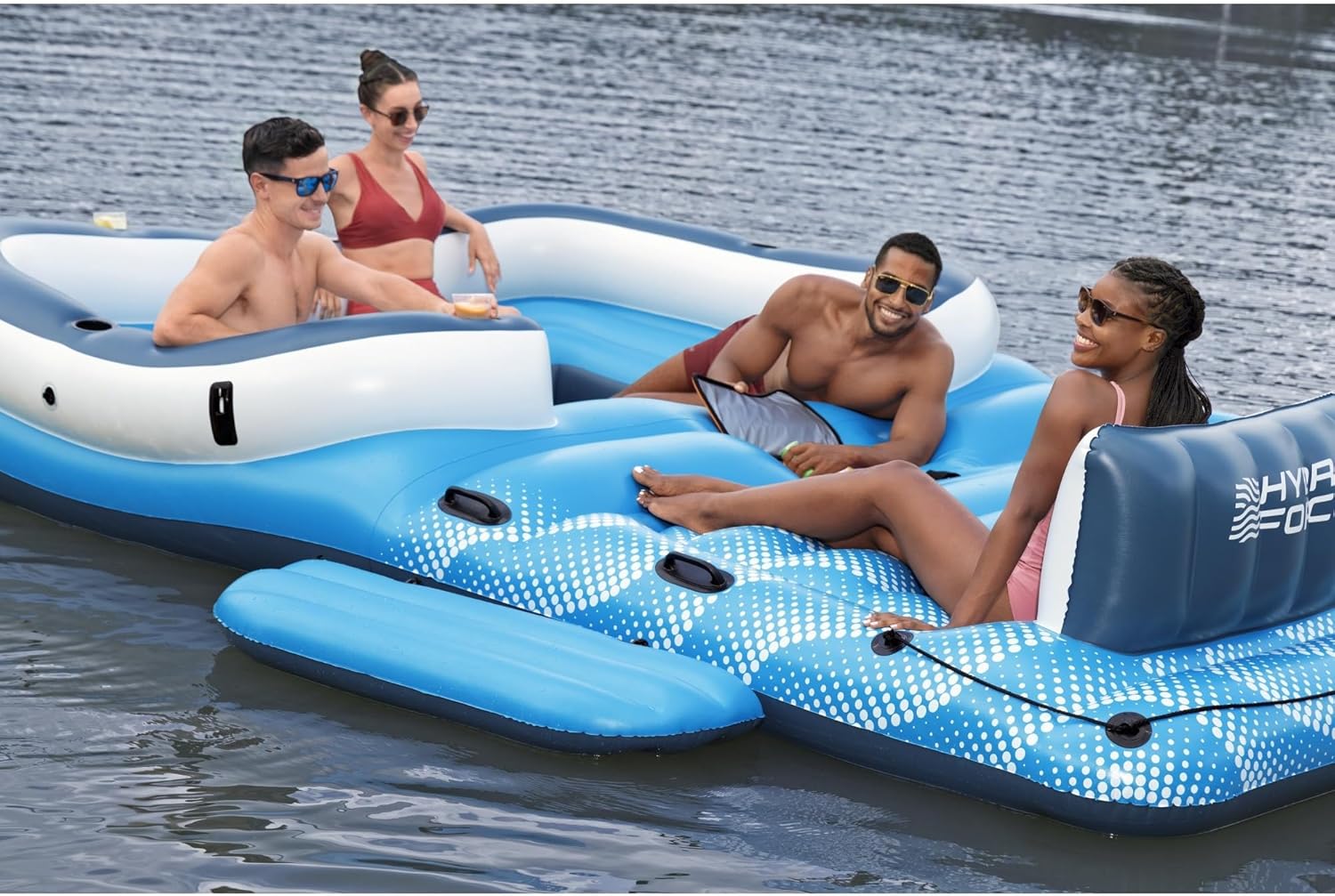 - Hydro-Force Tropical Breeze Raft: Large floating island ensures ultimate summer fun that comfortably fits up to 6 adults with supportive backrests similar to a small chair for relaxation.