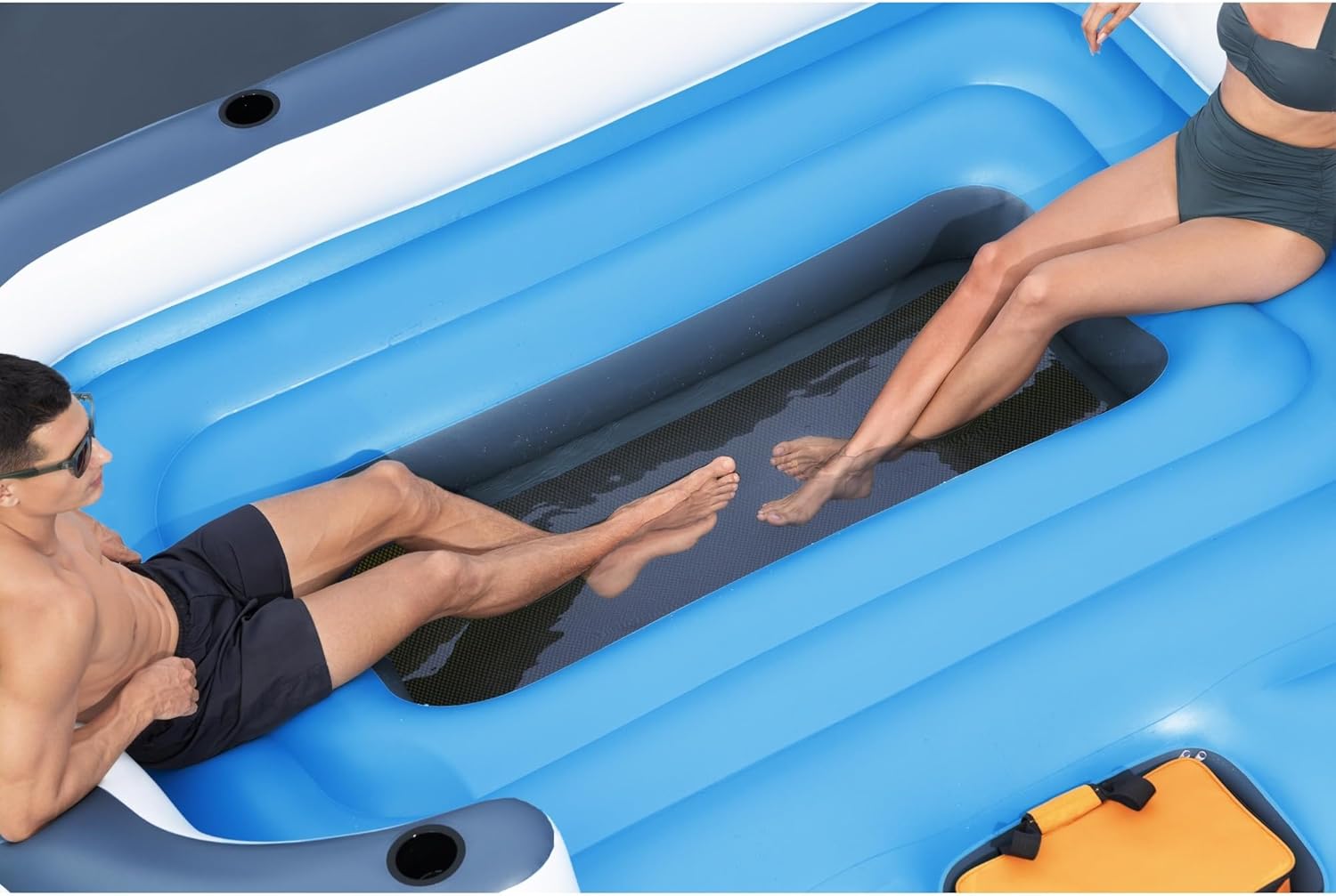 - Includes: Pool accessory that features 6 cup holders; Built-in cooler floating bar bag; All-around boat float grab line and handles or use the grab line to securely tie the float to a boat or dock.