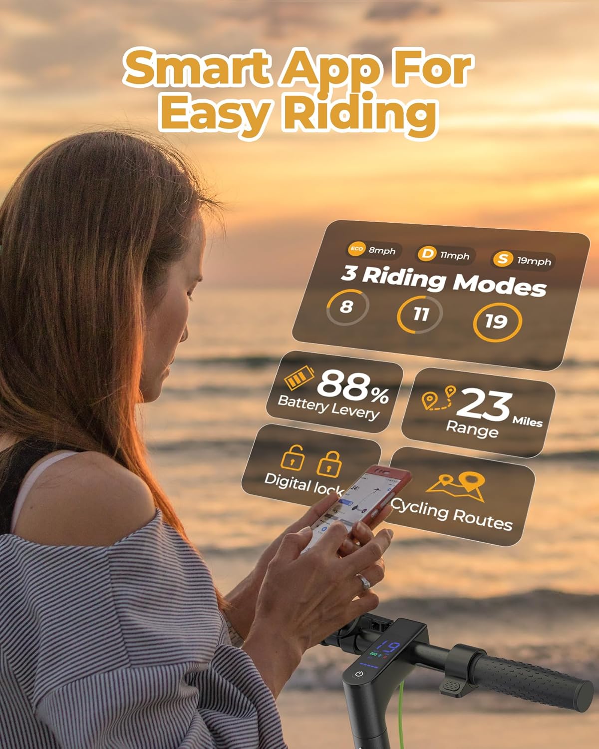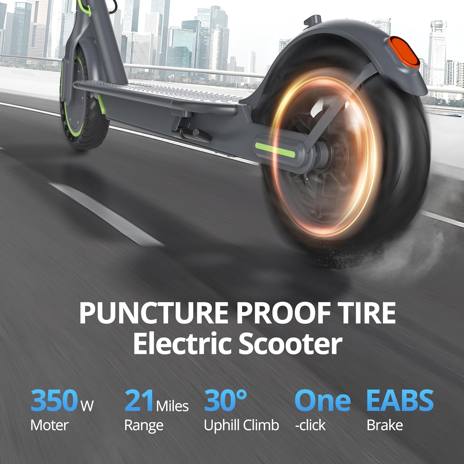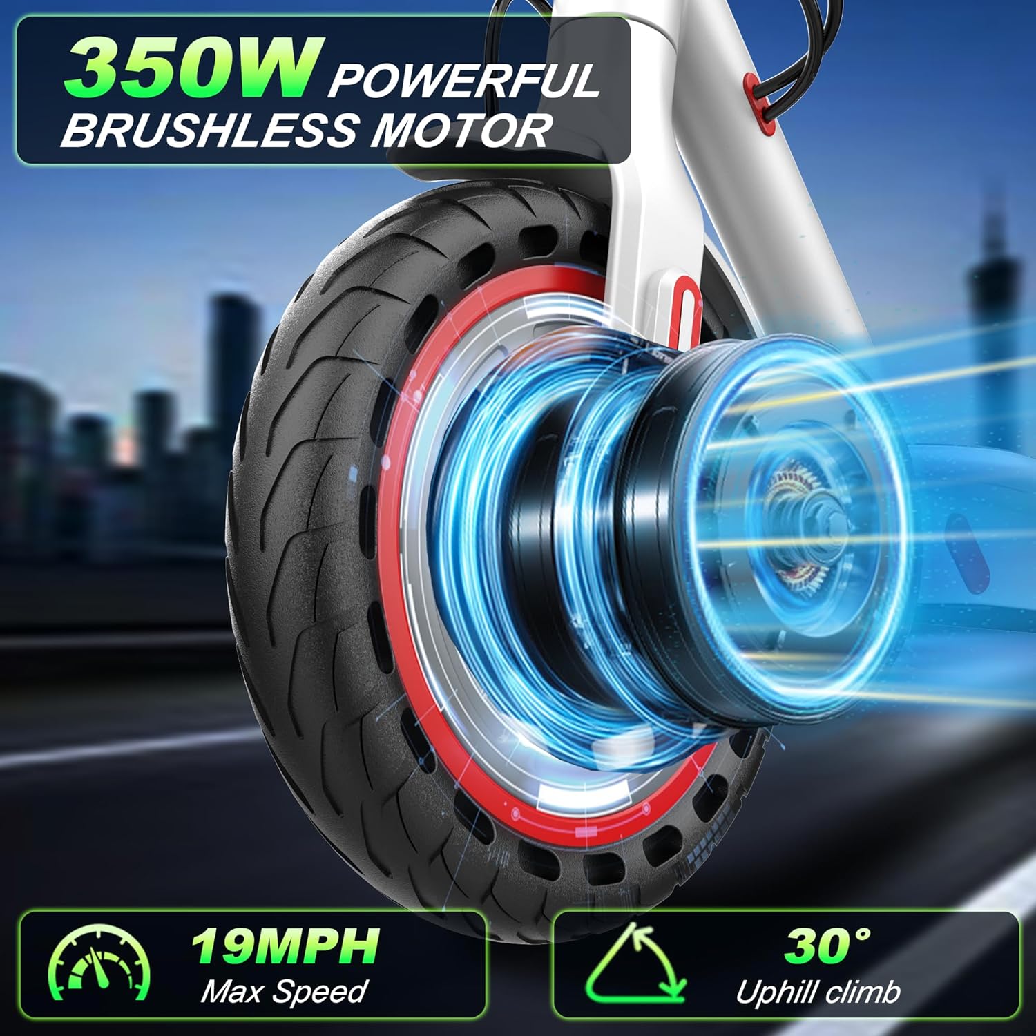 • Electric Scooter - 8.5" Solid Tires, 350W Motor, Up to 19 MPH and 21-23 Miles Long-Range Portable Foldable Commuting Scooter for Adults with Double Braking System and App