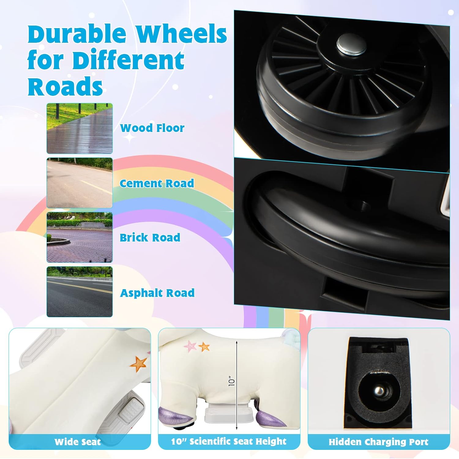 - More Child-friendly Design: The wide seat supports kid's body perfectly. Foot-to-floor design allows kids to exercise leg muscles. When toddlers feel tired. they can place their feet on the footrests. Meanwhile. the hidden charging port ensures convenient charging after play.