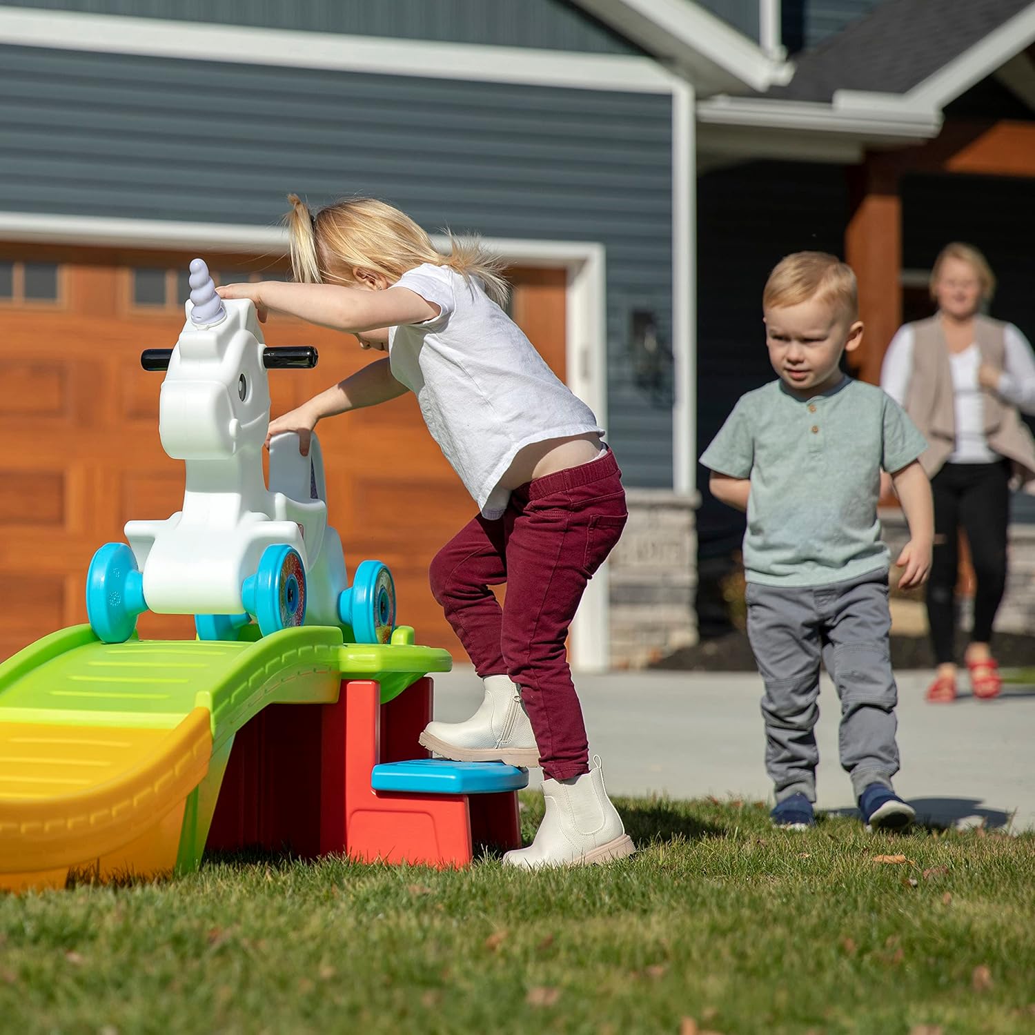 - OUTDOOR PLAYSET: Long 9-foot roller coaster track. unicorn coaster car. kids 2 - 5 years old. encourages independent play
