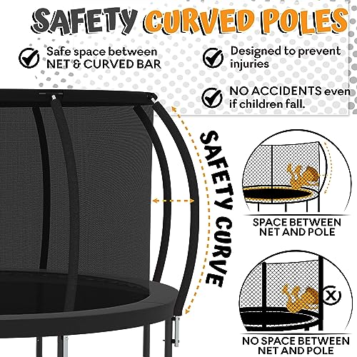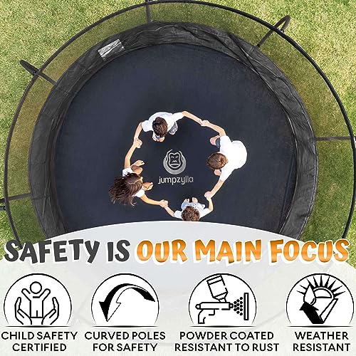 - 【 Your kid's fun and safety - Our Responsibility! 】 For your kids safety. we innovated our 12 FT trampolines with innovative curved poles designed to protect your children from accidents or injury. Jumpzylla trampolines comply with ASTM F381-16 Standard Safety Specification. we are extremely exacting when it comes to children safety.