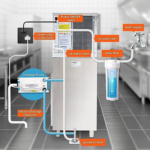 • Effortless Self-Cleaning: Extend your ice maker's lifespan with auto self-cleaning function. no the need for manual operation anymore. Combines with the filtered inlet pipe to remove impurities from the water. delivering clean and healthy ice. Furthermore. a UL-certified electric drainage pump is included. It features 3 outlets. facilitating the merging of drainage from the main unit and ice storage bin. With a lifting height of 6.56 ft/2m. it offers hassle-free drainage.