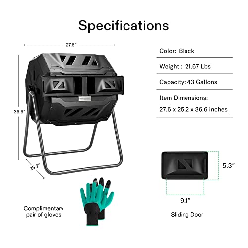 - Twin chambers: Two separate chambers allow one side to finish composting while leaving the other side available to add fresh wastes; Constant alternation of the two sides will create an uninterrupted stream of nutritious compost