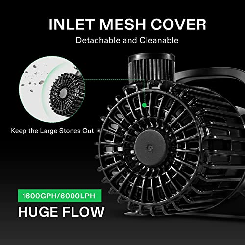 • Energy Saving with Low Noise: Ultra-quiet operation design(30-40db); Less power(100W) consumption with high output(1600GPH/6000LPH) which compared to other pumps; Fits for 264 Gallon Pond