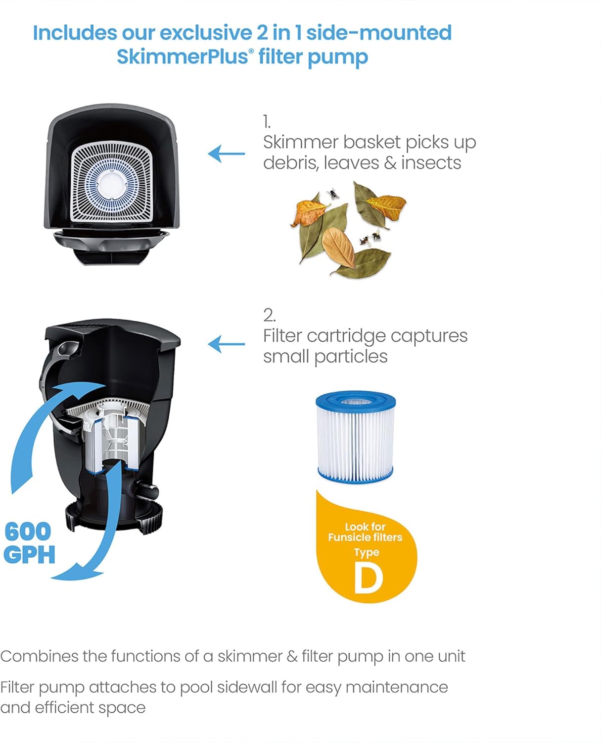 • Accessories Included: 110-120V SFX600 SkimmerPlus filter pump with GFCI. Type D filter cartridge. and a JetMaxx Aeration feature. providing you with cleaner. purer water. SureStep ladder. and a repair patch