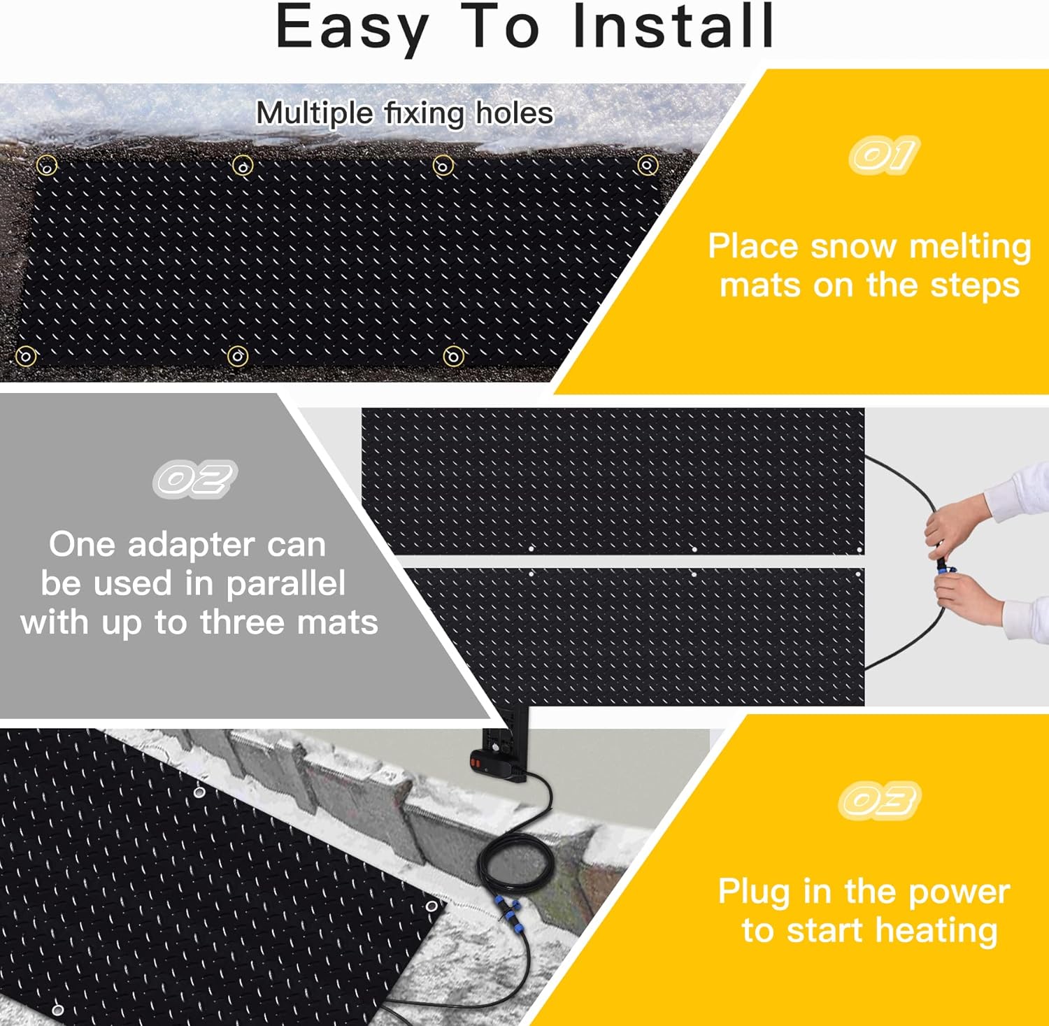 • Easy To Use: This walkway mat plugs easily into a standard 110-volt outlet with a 9.84ft power cord. earth leakage protection and UL listed plug. Providing you with maximum safety. One adapter can be used in parallel with up to three mats.