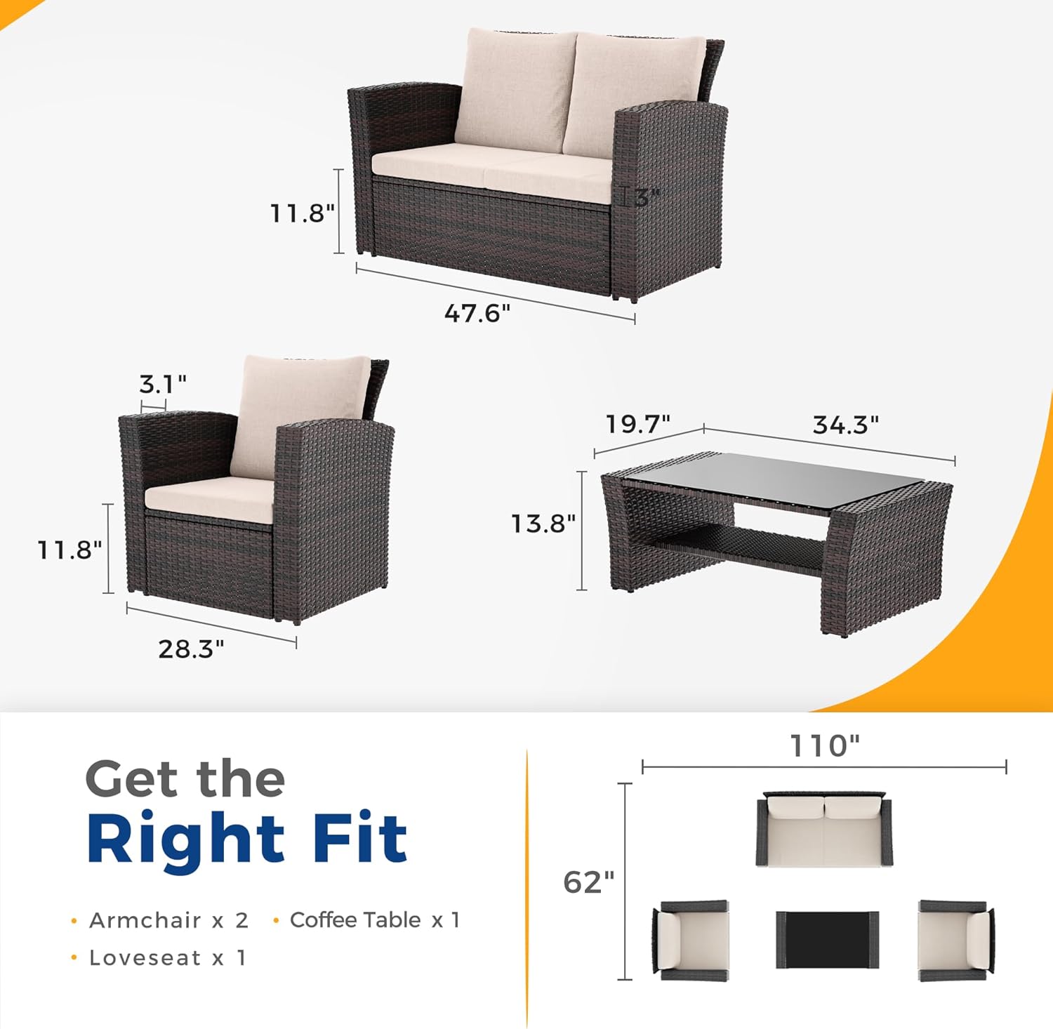 • 【Complete Set for Outdoor Enjoyment】The outdoor furniture couch set includes 1 x loveseat measuring 48" x 26" x 30.3". 2 x armchairs measuring 28.4" x 26.4" x 30.3". and 1 x coffee table measuring 34.3" x 19.7" x 13.8".which come in 2 boxes. They may not arrive together. If you encounter any issues. such as missing parts or damage. please contact us for support. With this complete set. you can make the most of the warm weather and enjoy outdoor living to the fullest.